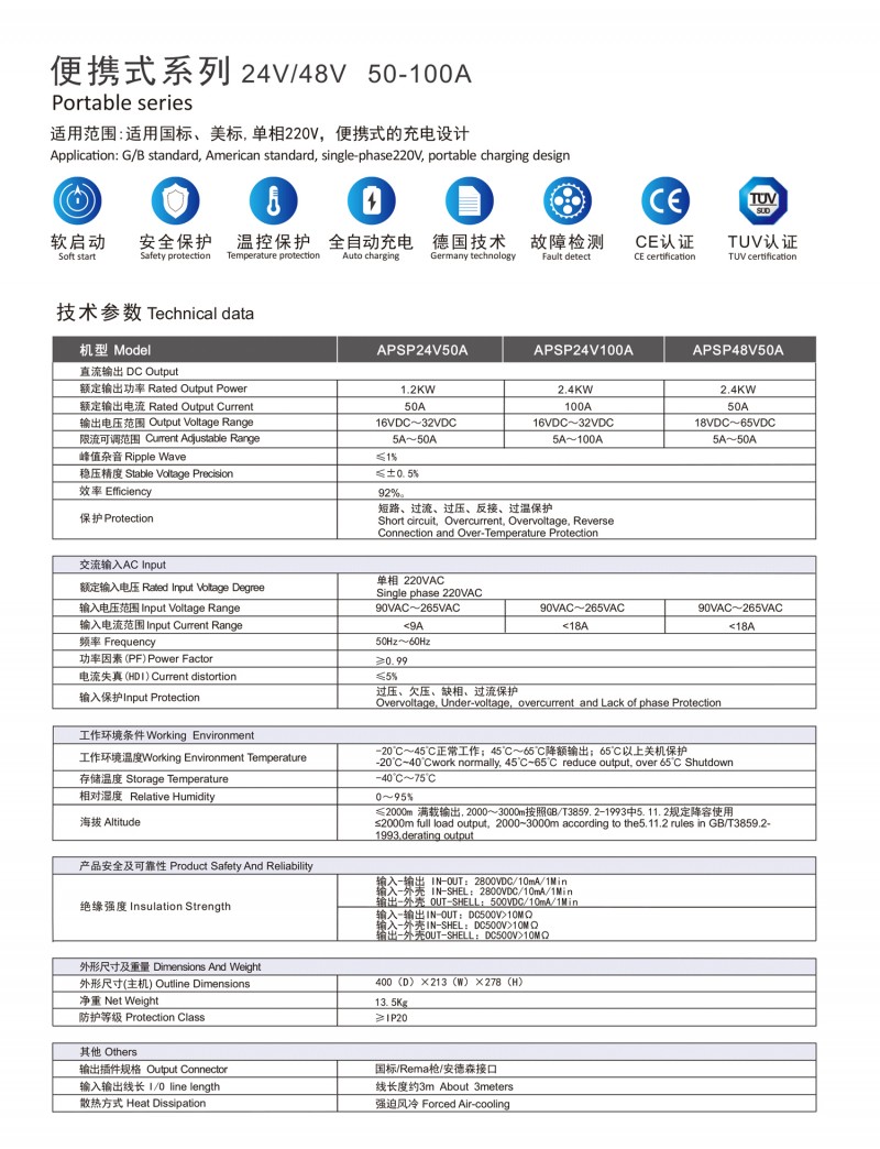 触摸屏智能操作设计:告别传统按键方式,给您带来更现代更具科技智能的操作体验 自动充电:插枪自动充电,简化充电流程,便于操作 兼容性高:80V200A兼容48V200A充电 多重保护: 输出短路,过流过压保护,反接保护,电流导管保护等多重保护 预约充电功能:避开高峰用电时段,有效节省成本 双语切换:中英文双语随需切换,跨越语言障碍,与世界接轨 人性化设计:充电机背板内部附部件明细及产品接线图,方便客户可更清楚的了解产品,便于维修,提高售后时效 独特设计: 内置电磁锁驱动模块,防止临时断电锁枪 使用寿命更长:功率模块预留20%空间,提高模块的使用寿命 出色内部结构: 内部结构左右出风,内部电路不容易积粉尘,提高充电机寿命