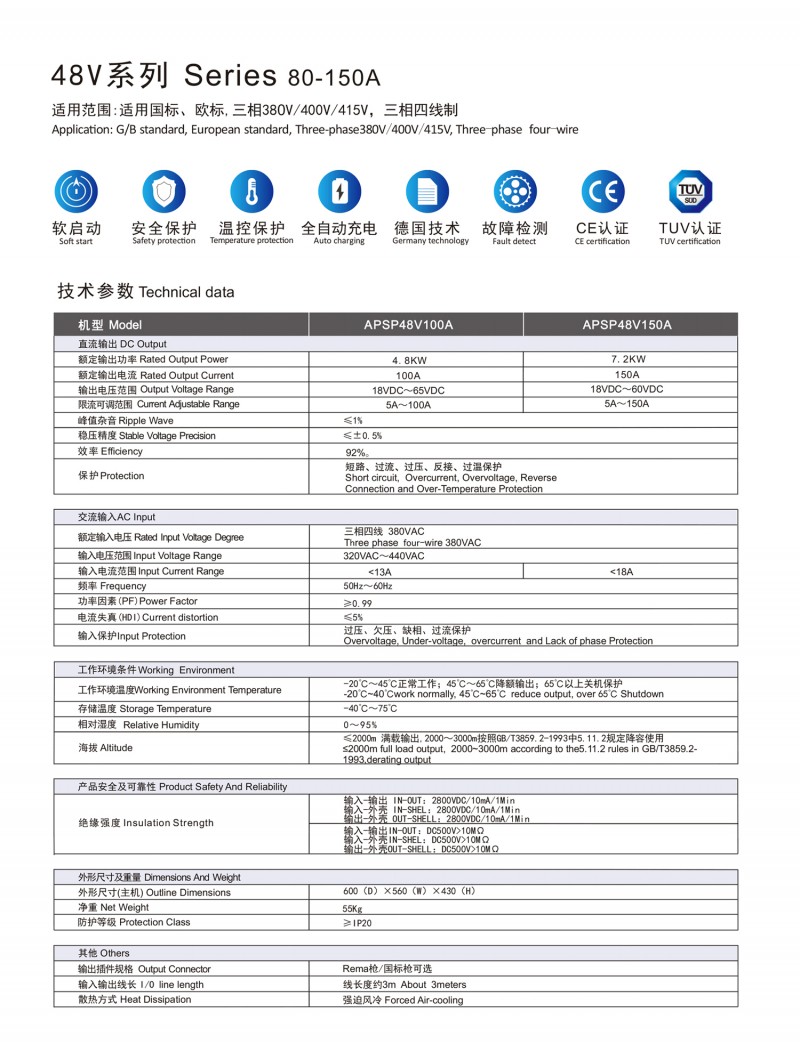 触摸屏智能操作设计:告别传统按键方式,给您带来更现代更具科技智能的操作体验 自动充电:插枪自动充电,简化充电流程,便于操作 兼容性高:80V200A兼容48V200A充电 多重保护: 输出短路,过流过压保护,反接保护,电流导管保护等多重保护 预约充电功能:避开高峰用电时段,有效节省成本 双语切换:中英文双语随需切换,跨越语言障碍,与世界接轨 人性化设计:充电机背板内部附部件明细及产品接线图,方便客户可更清楚的了解产品,便于维修,提高售后时效 独特设计: 内置电磁锁驱动模块,防止临时断电锁枪 使用寿命更长:功率模块预留20%空间,提高模块的使用寿命 出色内部结构: 内部结构左右出风,内部电路不容易积粉尘,提高充电机寿命