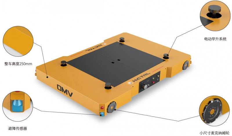 OMV潜伏背负式机器人整车采用低结构设计、高度仅为250mm,利用麦克纳姆轮实现零回转半径、侧移、全方位无死角任意漂移。可方便的潜入各类工件托盘下。穿行于托架之间、在狭小空间内全方位无死角任意漂移。通过加装电动举升系统,即可实现整体搬运各种工装及部件。实现对接、装配等复杂工作。