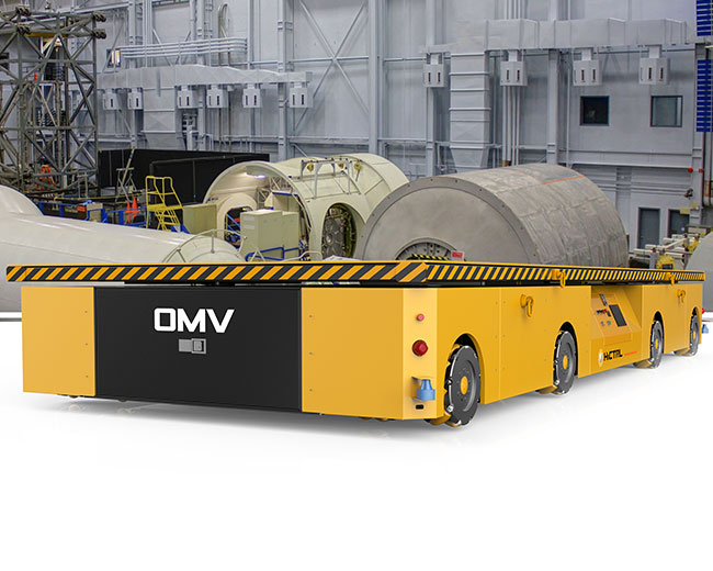 OMV重载部件转运设备利用麦克纳姆轮实现零回转半径、侧移、全方位无死角任意漂移,适用于重载设备及物件的狭小空间运输,通过轮组大小,数量的搭配,可以设计定制10吨--50吨载重的平台。