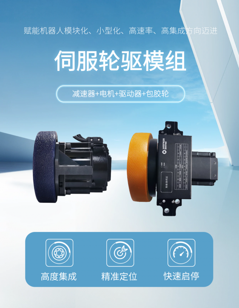 伺服轮驱模组各模块可灵活定制,根据不同用户的实际需求,电机功率以及减速比可以灵活调整,为客户提供了高度集成、易维护、性价比高的运动控制解决方案。
