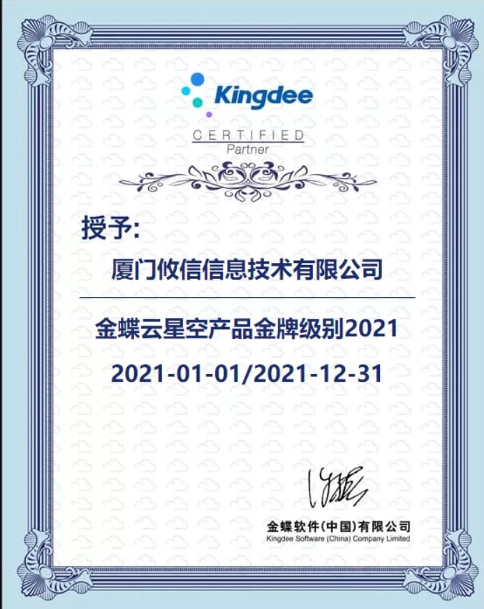 发证机构:   金蝶(软件)中国有限公司 发证时间 :   2021-01-01