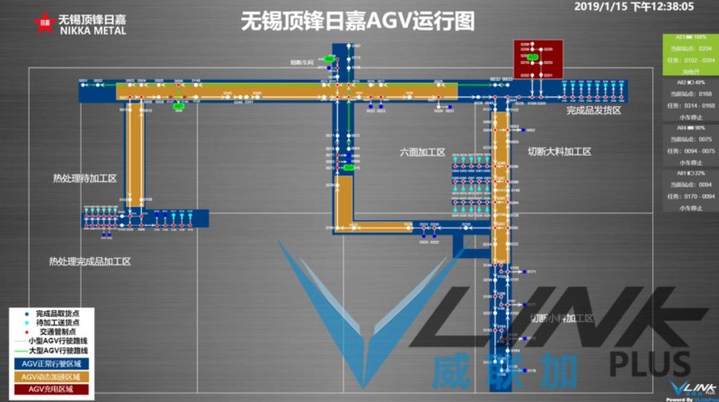 无锡顶锋日嘉为提高物料和在制品的流转速度,要求物料及在制品的运输全面采用AGV调度系统自动运输。通过威联加AGV智能调度系统的实施,实现AGV运输的灵活调度和线路优化,大幅度提升物流的效率,实现快速精准运输。路线设计根据现场状况设计3种类型的行驶路线:AGV正常行驶区域、AGV动态加速区域、AGV充电区域,在行驶的路线上通过各节点的不同功能指导小车的行驶路线。