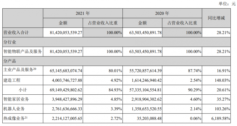 2015年以来,海康威视鼓励内部员工创新创业,建立内部创新跟投制度,先后成立了8个创新业务。2021年,有5个创新业务的收入超过10亿、净利润为正。其中,公司智能家居业务营收达到了39亿元,同比增长35.27%、机器人业务营收达到了27亿元,同比增长103%、热成像业务营收达到22亿元、同比增长6189.58%。年报显示,萤石网络已经递交IPO申请;海康机器人拟分拆上市,相关筹备工作正在推进中。