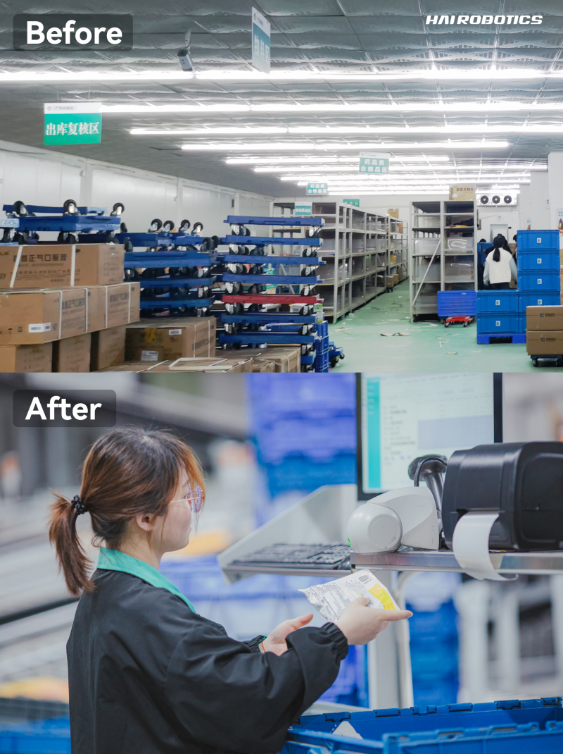 此外,传统的人工仓库里,货架不能太高,否则人手难以拿到,但这就造成了库容量低的问题。在中智的旧人工仓里,超过5万件货品就会产生爆仓的现象。得知海柔创新开创了箱式仓储机器人的品类并处于行业龙头地位,且在鞋服行业有多个成功的落地项目,中智决定携手海柔创新ACR进行仓储自动化升级,在提升存储密度和拣选准确率、提高人效、减轻劳动强度等方面进行优化。