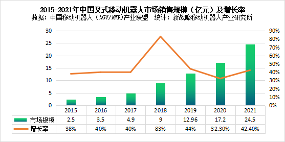 图表:2015-2021年中国叉式移动机器人市场销售规模(亿元)及增长率