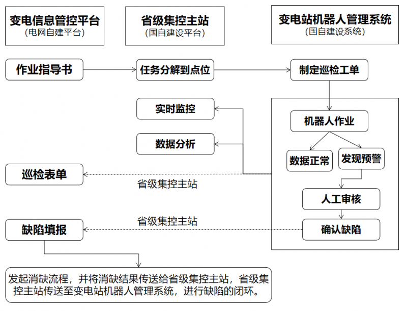 国自智能巡视解决方案使“变电信息管控平台业务流”、“省级集控主站业务流”、“变电站机器人管理系统业务流”三条业务流实现闭环,三个系统均可派发巡检任务使机器人精准作业,及时将数据回传至省级集控主站及变电信息管控平台,系统互通互联,打通上下数据流,变电站整体巡检效率、巡检精度、变电站信息化水平显著提升。