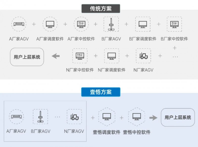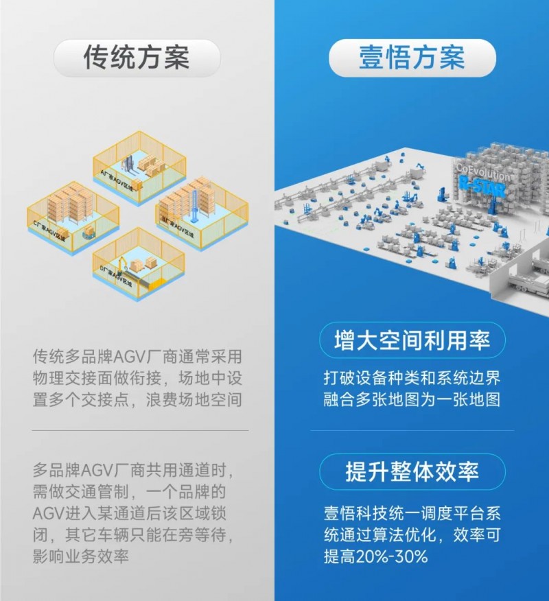 壹悟科技星罗自动化工厂解决方案,可打破设备种类与品牌的边界,将原本封闭运行的硬件区域融合互通,把分裂的“多张地图”合并为一张地图,实现多种设备的信息互通,真正实现效率与空间利用率的双向提升。