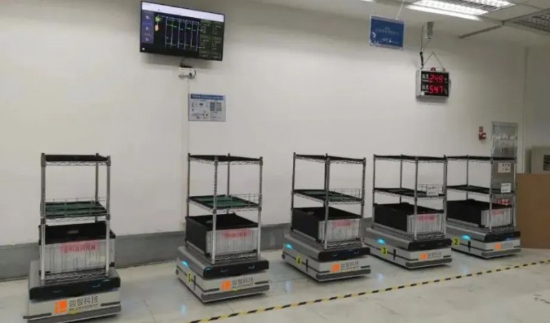 国内首例百级无尘环境AMR应用项目。用户通过迦智科技提供的智造物流整体解决方案,实现在2000平米的百级洁净车间内,种类繁多,形状、大小、质量各异的三大种类、十余种物料,在产线各道工序间的自主柔性周转,保障了物料供给的时效性和准确率,后续进行二次复购。