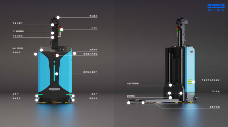 仙工智能 SRC 系列核心控制器打造的激光 SLAM 智能叉车整车实现多种传感器的超高配置,360° 立体安全防护,提升了 AMR 运行过程中的安全等级,包括:导航激光、前后避障激光、安全触边、距离传感器、急停按钮、3D 避障相机等。