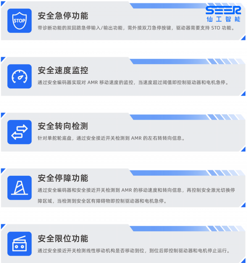 仙工智能以智能控制器和数字化软件为核心的产品组合中,将安全作为第一要义,从产品研发到产品测试到最终交付,始终贯彻安全守护课题,为客户打造更安全的 AMR。
