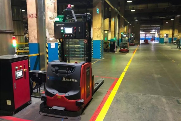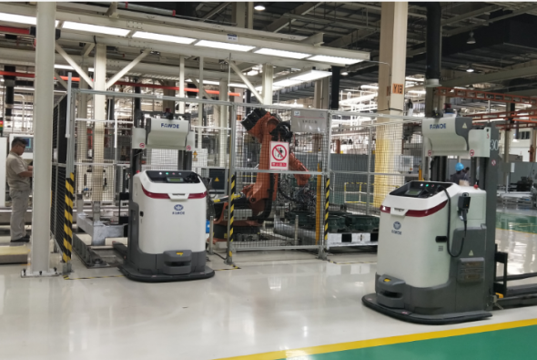 该项目中,通过多台艾吉威叉车AGV在提升机/转存区/生产工位连续协同工作,实现厂内物料供应的自动化转运。