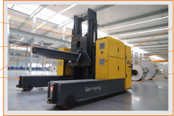 采用叉车式激光导航实现超重载(20吨级+)、无容器、大尺寸、多形状约束条件下安全防护等级、定位精度、接驳形式等无人化作业...