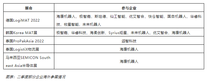 二季度,海外比较受关注的展会如德国LogiMAT 2022及韩国Korea MAT展都吸引了不少国内企业的参与,如海康机器人、极智嘉、斯坦德、仙工智能、优艾智合、快仓智能、国自机器人、华睿科技、牧星智能等,都携旗下代表性产品及方案一一亮相。