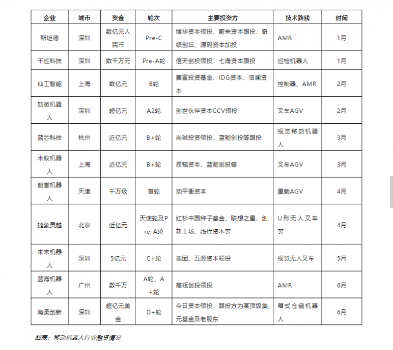 从资金投入来看,大部分企业融资金额都在亿元级以上,其中,海柔创新与未来机器人两家企业在上半年拿到了行业最多的融资。