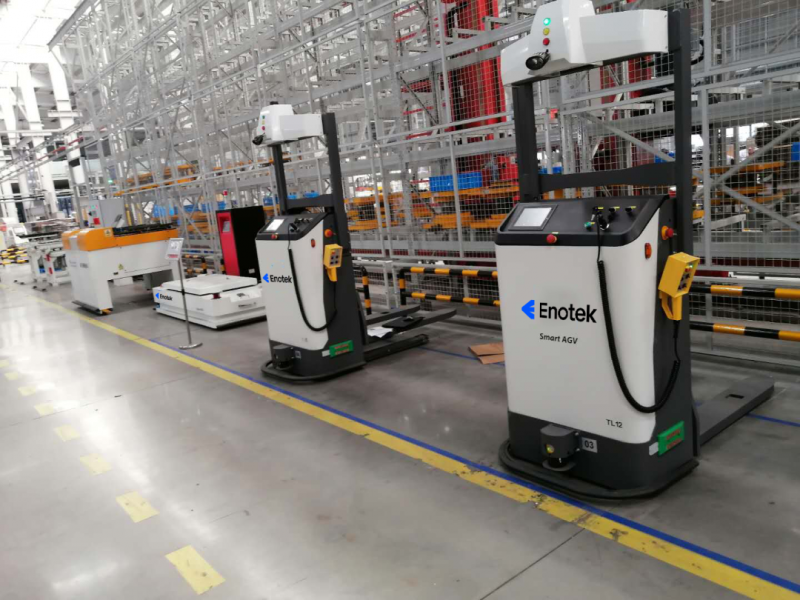 爱仕达智能工厂智能仓储项目集成了17台堆垛机、25台AGV及相关调度软件,以实现产线换模换线自动化流程。其中,AGV代替原来的人工串联起生产车间的物料搬运作业。