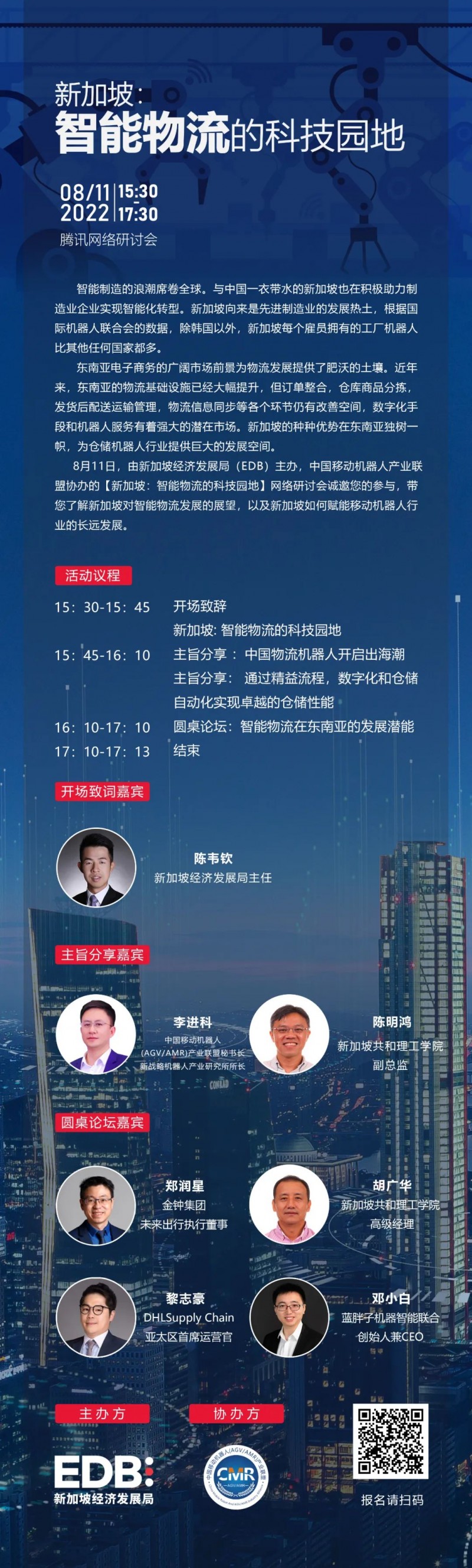 由新加坡经济发展局 (简称经发局EDB) 主办,中国移动机器人产业尊龙凯时协办的“新加坡:智能物流的科技园地”网络研讨会将于8月11日举行。