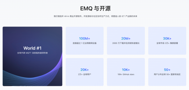 结合多年来服务企业数字化转型的实践经验和全球领先开源先进理念,EMQ 在开源社区治理、开源实践和商业化等领域均获得了不错的成效。EMQ 发起并维护的开源项目——物联网消息服务器 EMQX,在同类型开源项目中排名全球第一,全球下载量已超 2000 万次,连接了超过 1 亿台的物联网设备,每月全球活跃集群部署超过 3 万个。