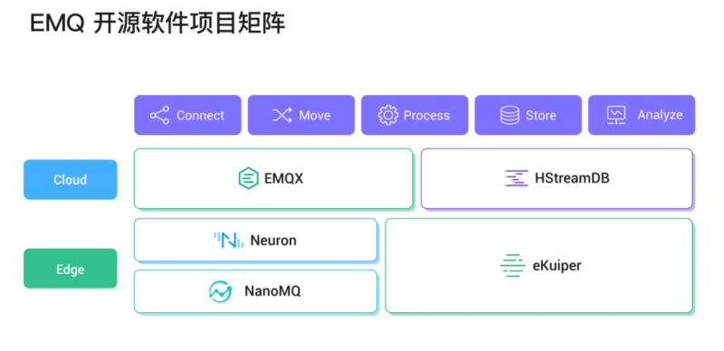 在边缘端,EMQ 开发了工业协议解析转换的工业网关软件 Neuron,它可以一站式接入各种各样的工业协议,将其转换成标准的物联网 MQTT 协议,实现繁杂工业设备的接入;用于物联网边缘计算的超轻量级 MQTT 消息服务中间件软件 NanoMQ;还有一款是目前托管在 Linux 基金会下面的 eKuiper 项目,主要用来实现边缘的流式数据处理。
