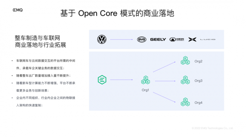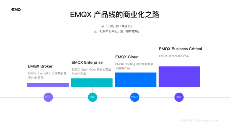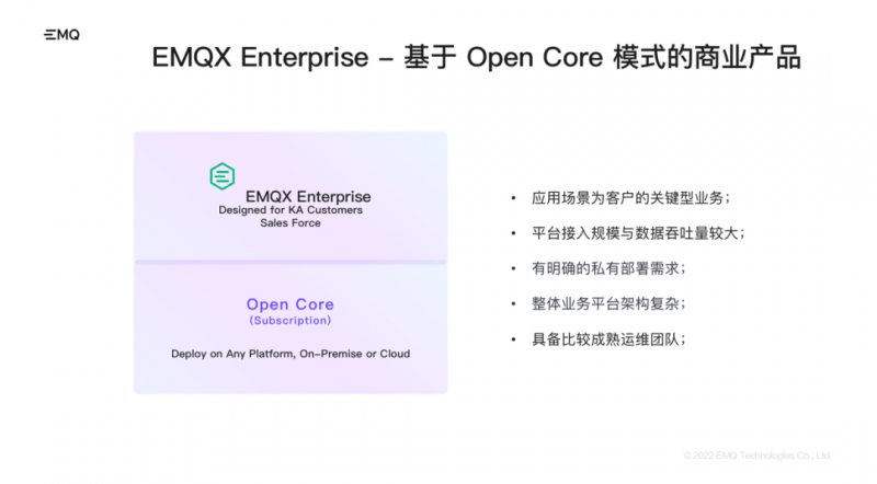 此外,EMQ 基于 EMQX 开源项目还开发了私有部署版  EMQX Enterprise,基于 Open Core 模式的商业产品,主要技术优势在于高并发、高扩展性、大吞吐场景下保持长久稳定的数据接入服务。为不同类型和规模的企业客户构建关键业务的物联网平台与应用。
