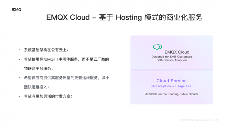 目前来说用户对云服务的模式普遍是比较接受的,因为这样的服务是开箱即用的,可以免去用户对软件的运维和维护。EMQ 的开源商业化探索主要聚焦在 Open Core 模式和 Hosting 云服务模式。