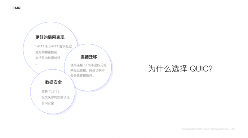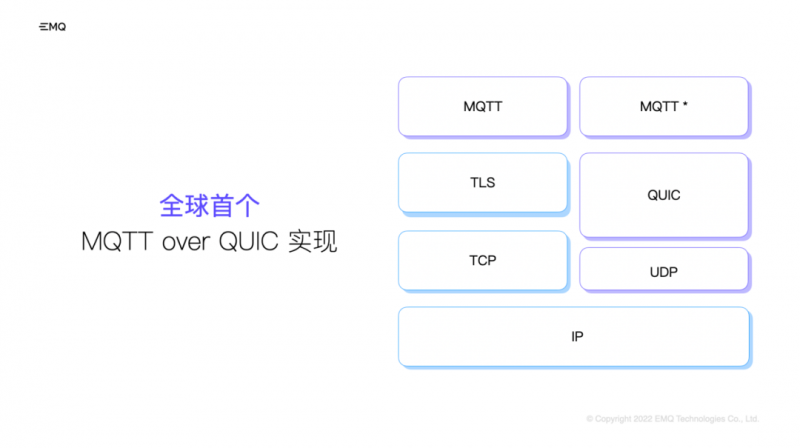 QUIC 作为底层传输协议,与 TCP 协议相比,在减少连接开销与消息延迟的同时,提升了整体吞吐量和移动连接的稳定性,非常适用于物联网消息传输场景。