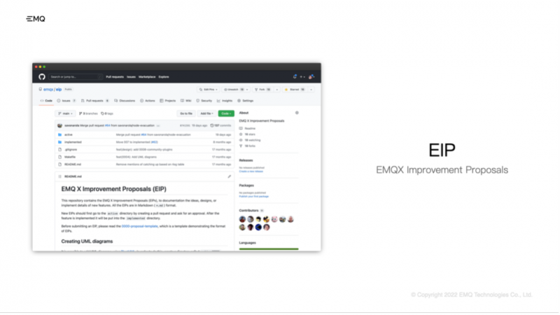 在 EMQX 5.0 绝大部分的重要功能改进中都采用了 EIP 这的方式,记录一些重大更改的设计过程,这样除了 EMQ 的研发团队以外社区的用户也可以参与到这些重大变更的讨论中,来贡献他们在代码以外的力量。