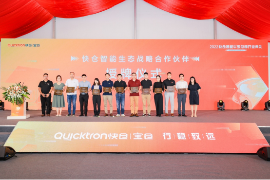 图:快仓智能联合创始人兼CTO倪菲介绍“鸿鹄”C56机器人行业发展离不开产业链上下游的协同,快仓智能也正积极联合上下游不同领域企业,一起构建移动机器人生态圈。在2022年度战略生态伙伴授牌仪式上,快仓智能为激光雷达、减速机、驱动器、芯片等多个领域的合作伙伴颁发奖牌,未来,快仓智能将立足于自身产品技术,以开放共赢的态度与生态圈企业联合,更好的赋能终端应用客户。