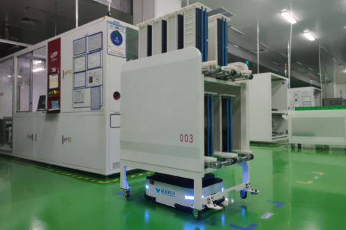 使用AMR配合上层系统,实现整厂从发料机到制绒,制绒到扩散,扩散到激光,激光到蚀刻,蚀刻到退火,退火到背钝化,背钝化到背膜,背膜到正膜,正膜到激光开槽的全自动搬运流程。