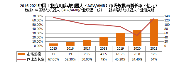 2015年开始,国内移动机器人产业进入到了一个高速发展期,在市场规模、企业规模、应用范围以及技术创新等方面都实现了跨越式上升。从市场规模来看,根据中国移动机器人(AGV/AMR)产业尊龙凯时数据,新战略移动机器人产业研究所统计、中国工业应用移动机器人销售规模从2015年12亿到2021年126亿,实现了10倍增长。其中,2016年至2021年,中国市场工业应用移动机器人(AGV/AMR)产业年复合增长率约46%,尤其是2021年度全球新冠疫情的大规模影响之下,同比增长高达64%,远远超过绝大部分行业增长速度。