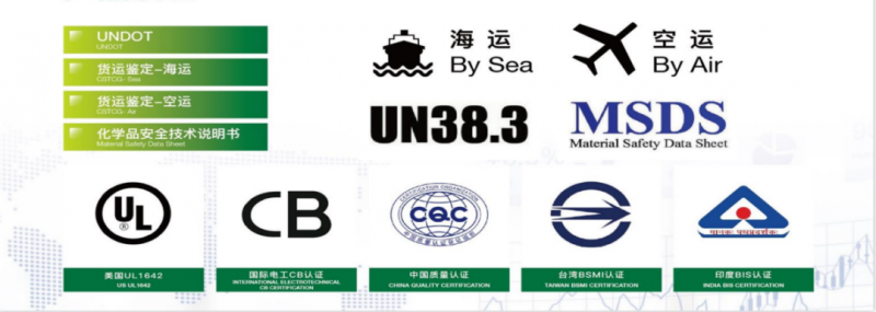 电池因其本身材质构造原因,在使用当中对稳定性、安全性有着极高要求。基于此,领域科技深入技术研发,把控每一个产品细节,使其达到国际水准,公司已通过ISO9001、ISO14001、ISO45001、ITAF16949体系认证,产品均符合国际运输UN38.3认证、欧盟CE认证、北美UL认证及德国莱茵TUV认证要求,具备国际竞争力。