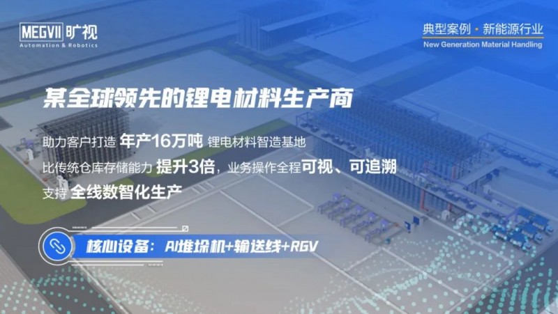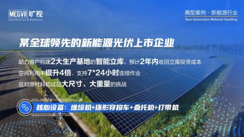 旷视看到,无论是锂电原材料、动力电池还是光伏等新能源企业的生产设备的自动化改造已经达到较高水平,企业通过工艺管理、工艺改进和精益制造实现了很好的效益提升;目前正在加紧部署物流机器人和智能立库系统,对物流环节数智化升级,以进一步提升工艺管理和交付能力,实现降本增效。
