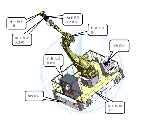在叶片切割打磨系统的应用案例中,航天智造导入了全向移动AGV载六关节臂式机器人,机器人腕部配ACF自适应浮动系统,激光及视觉引导自动打磨切割,航天定制切割打磨头,实现60米以上叶片2个小时内完成前后缘处理;风电叶片打磨机器人系统,属于大型曲面磨抛技术,主要技术点在于恒力控制和AGV协同机器人轨迹规划技术,一支叶片60米一次打磨率超过80%,完成效率不超过2个小时。
