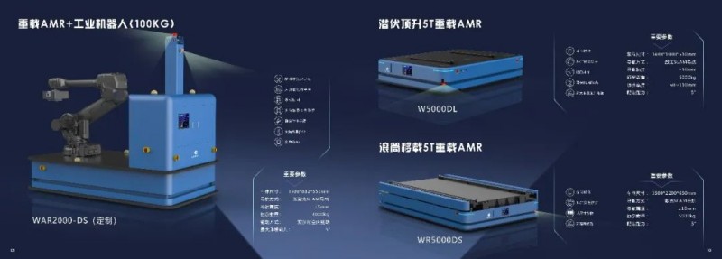 近期,为适应更多的应用场景,井智机器人自主研发的重载AMR (Heavy-duty AMR)全面上线。井智机器人的重载AMR利用OMS、WMS、TMS、FMS,能够协助客户实现数字化、智能化的产业升级。如图示的WR5000DS,负载最高可达到5000KG,产品定位精确,行驶路径灵活多变,滚筒移载柔性化程度高,可快速全局部署,适合多种现场环境。