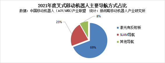 从产品类别分布看,2021年,激光有反射板叉车依旧是市场应用主流,占比为69%,其次是SLAM导航无人叉车,在一些对机器人柔性化程度要求高的场景中逐渐渗透,占比为23%。