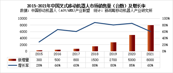 图表:2015-2021年中国叉式移动机器人市场销售量(台数)及增长率