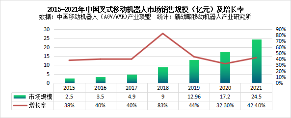 图表:2015-2021年中国叉式移动机器人市场销售规模(亿元)及增长率