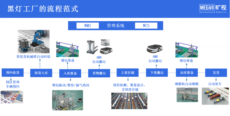 作为深耕行业的新一代智慧物流服务提供商,旷视打造了一套面向“黑灯工厂”物流仓储部分升级的流程范式,实现从预约收货到卸货入库、入库准备、货物搬运、上架存储、下架搬运、出库准备、发货的全流程智能化、自动化、无人化。
