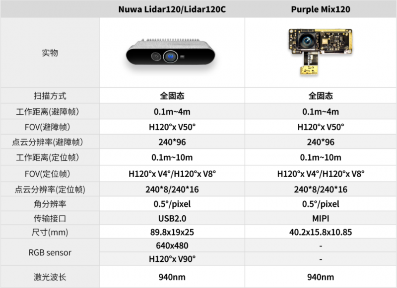 产品将重点针对机器人应用领域,有效解决导航、避障功能模块分离造成的机器人整机产品形态设计困难、传感模块多而成本高的问题。此外,传统的LDS、单点/多点dToF线扫导航模块都需要采用机械式或半固态的设计,可靠性易受影响,而Nuwa-Lidar120和PurpleMix120都采用了全固态的方案,产品内部没有任何的机械振动和微机械振动,是针对产品可靠性和寿命优化最理想的方案之一。