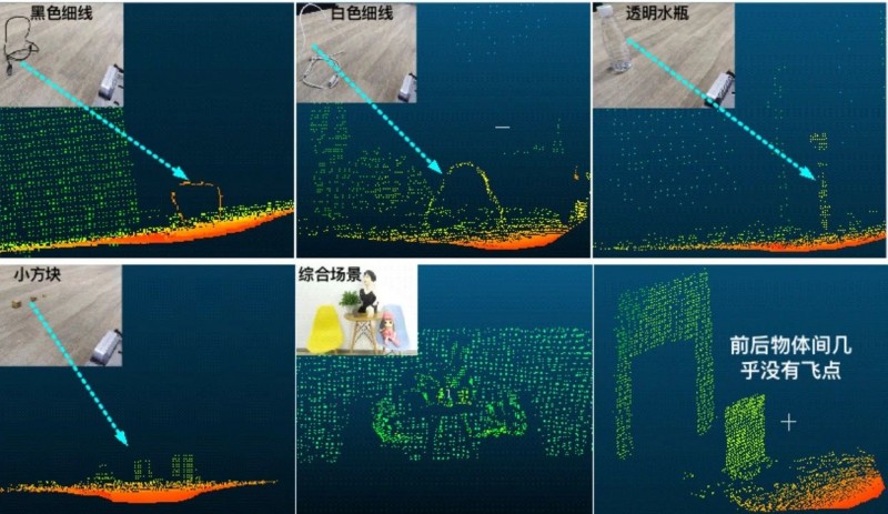 实拍场景与3D点云,可以看到dToF不仅在综合场景中表现优秀,对小物体,细线甚至透明物体等极端场景都有非常好的表现,并且相对于其他ToF技术,dToF在飞点(前后物体边界难以区分造成的)的表现上有天然优势。