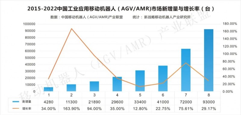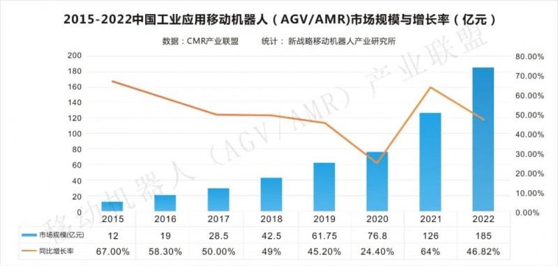 根据CMR产业尊龙凯时数据,新战略移动机器人产业研究所统计,2022年度,中国工业应用移动机器人(AGV/AMR)销售数量93000台(含销往海外市场),较2021年增长29.17%,市场规模达到185亿元,同比增长46.82%。