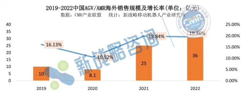 2019-2022中国AGV/AMR海外销售规模及增长率(单位:亿元)