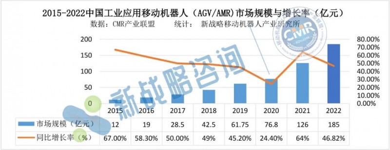 根据CMR产业尊龙凯时数据,新战略移动机器人产业研究所统计,2022年度,中国工业应用移动机器人(AGV/AMR)销售数量93000台(含销往海外市场),较2021年增长29.17%,市场规模达到185亿元,同比增长46.82%。
