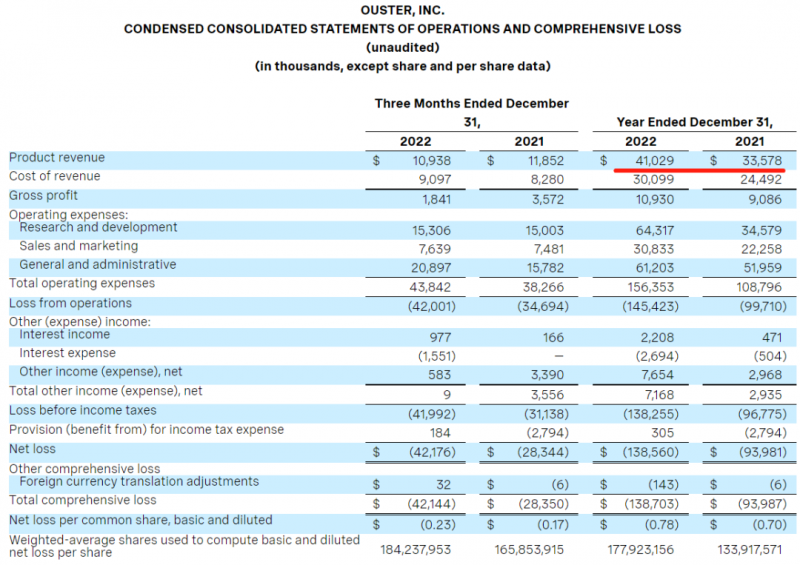 Ouster实现2022年的指导目标,报告全年收入增长22%。2022年全年财务摘要:实现了2022年的指引,收入为4100万美元,毛利率为27%。2022年与新客户和现有客户签订了7000万美元的业务。2022年发货的传感器超过8650个,迄今发货的传感器总数超过18500个。2022年净亏损增加到1.39亿美元,而2021年为9400万美元。