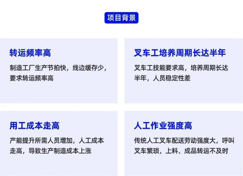汽车行业生产制造节奏快,生产节拍紧凑,对场内物流转运频率要求高。一个生产制造原料的延迟或将导致整个产线的停滞、延后,严重影响整个工厂的生产效率。