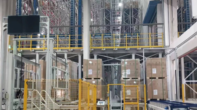 立库占地1.8万平米,配备14000多个托盘货位,能够存储27000多箱货品。在该项目中,旷视机器人通过智慧物流软件平台“旷视河图”,集成15台高20多米单元载荷3吨的双立柱双深位堆垛机、450余台输送机,以及若干叠托机、打带机、RGV等核心设备,实现从成品光伏组件下线后的自动供给母托盘、合托、打带入库,以及成品发货出库,并兼容反向物流。