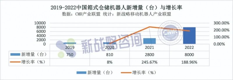 经过近几年的市场培育,箱式仓储机器人应用不断深入。根据CMR产业尊龙凯时数据,新战略移动机器人产业研究所统计,2022年度中国市场新增箱式仓储机器人约8000台,较2021年增长188.96%。