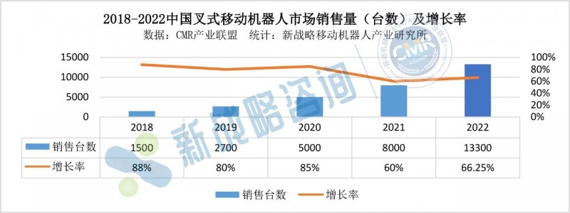 图表:2018-2022年中国叉式移动机器人市场销售量(台数)及增长率