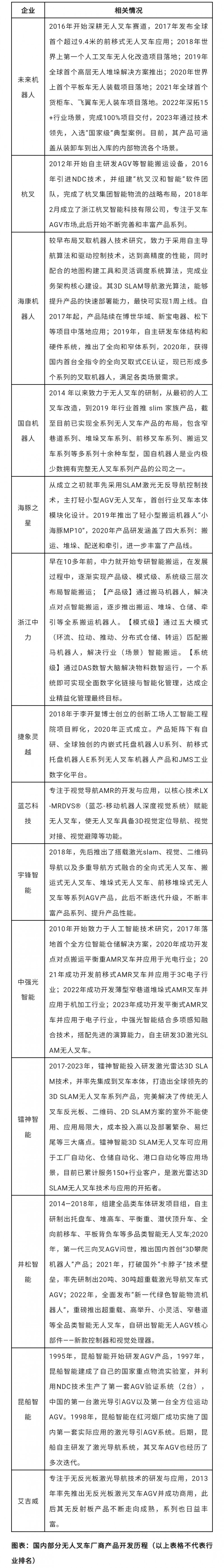 总结:从当前的市场情况来看,无人叉车应用尚未完全起量,离替代传统叉车尚有很长一段路要走。制约其规模化应用的因素有很多,但核心在于相对于人工叉车,在很多场景,从效率的角度而言,无人叉车尚不能完全替代人工叉车。而纵观当前无人叉车厂商们的创新方向,无论是更柔性的导航方式、新形态的探索还是小型化、标准化、模块化的产品的开发,其落脚点都是如何进一步提升无人叉车的应用效率,切实地帮助终端客户实现降本增效,这是无人叉车走向规模化应用需要突破的关键,也是所有无人叉车厂商未来要努力的方向。