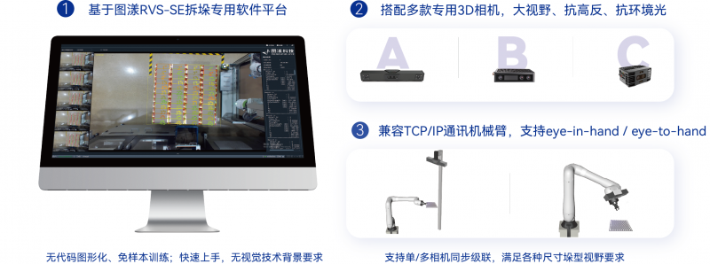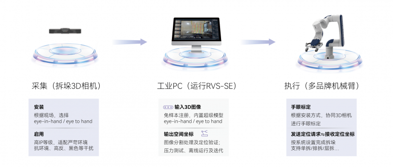 RVS-SE标准拆垛方案产品,由RVS-SE软件和固定搭配的3D工业相机组成,用户可以自选机械臂和前端执行部件、工控机。